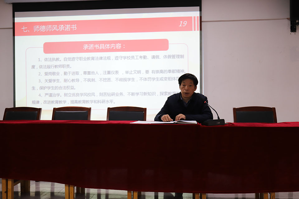 为深入贯彻落实习近平总书记在全国教育大会讲话精神,积极推进《全面深化新时代教师队伍建设改革的意见》,加强师德师风建设,提高教师思想政治素质和职业道德水平。万博mantex网页登录于3月18日在教学楼报告厅召开了师德师风培训会,常务副校长汤宗明参加会议。会议由校党委副书记、校办主任刘芝兰主持,全体教职工参加会议。